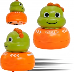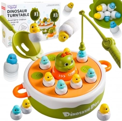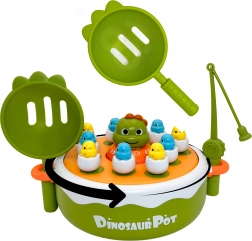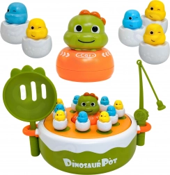 Igrališna baza s ručkama je kompaktna i spremna za brzu akciju: djeca mogu loviti dino–piliće pomoću magnetske udice ili ih katapultirati i hvatati lopaticama. Na drugoj strani baze nalaze se križić–kružić za mirniju natjecateljsku igru, a veliki slatki dinosaur–autić dodaje novu dimenziju maštovitoj igri.