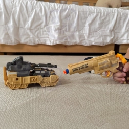 Sadržaj pakiranja: 1× transformirajući robot/tenk, 1× pištolj (revolver), 3× pjenasta strelica, dodatna borbena oprema.