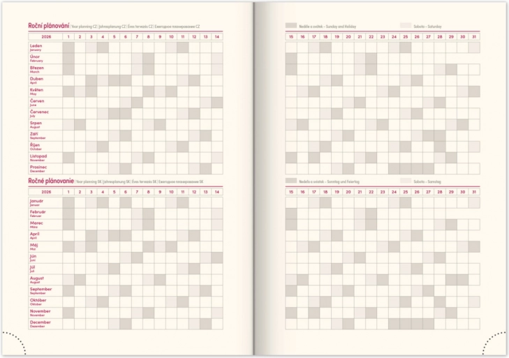 Stilski i cjenovno pristupačan tjedni dnevnik Essenza od ekološkog papira spaja praktičnost s održivošću. Nudi češko‑slovački kalendarij s dodatnom engleskom, njemačkom, mađarskom i ruskom.