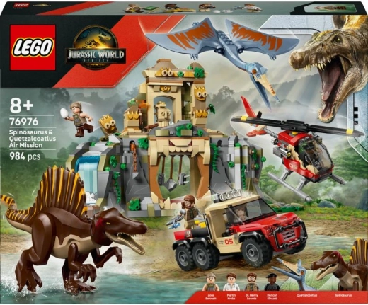 Doživite filmski nadahnutu akciju u džungli: drevni hram s vodopadom skriva gnijezdo s jajima, tajne prolaze i zamku koja se aktivira lancem. Pokretni Spinosaurus (noge, šape, rep, glava i čeljust) i veličanstveni Quetzalcoatlus (krila i čeljust) dodaju realistične scene potjere i spašavanja.