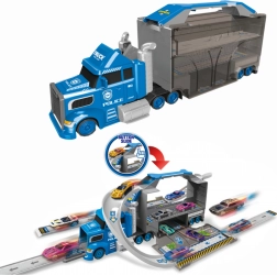 Veliki policijski kamion marke WOOPIE u trenu se pretvara iz transportnog seta za autiće u potpuni trkaći set s garažom i stazom. Otvaranjem prikolice otkriva se unutarnja igraća zona s rampama, petljama i znakovima gdje djeca mogu organizirati napete utrke i dvoboje.