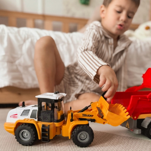 Model je izrađen od kvalitetnih materijala i ima velike izdržljive gumene kotače za stabilnost. Otvarajući poklopac motora otkriva “motor”, a uklonjivi prednji alat povećava raznolikost igre (mogućnost zamjene s drugim strojevima). Igra s utovarivačem razvija finu i grubu motoriku, maštu, kreativnost i logičko razmišljanje.