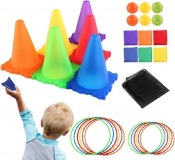 - 6 plastičnih čunjeva; 6 kolutova Ø 14 cm; 6 kolutova Ø 16 cm; 6 mekih bacajućih vrećica; 6 plastičnih loptica; mrežica za prenošenje