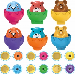 Set sadrži šest šarenih jaja, unutar kojih ćete pronaći vesele životinjice. Zadatak djeteta nije samo otvoriti jaje, već prije svega smjestiti ga na pravo mjesto u posebnom držaču. Svako jaje na donjem dijelu ima jedinstveni geometrijski oblik koji odgovara jednom otvoru u postolju. Pritiskom na figuricu životinjice čuje se zvučni efekt. Vesele facice na ljuskama izvrstan su način da djeca nauče prepoznavati i imenovati emocije.