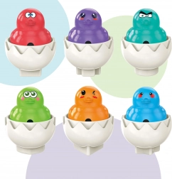 Igriva jaja brenda Woopie uvode vaše dijete u svijet pun boja, oblika i veselih lica. Svako od šest simpatičnih jaja skriva šareno piliće sa smiješnim izrazom i pri pritisku proizvodi zvučni efekt. Cilj je ne samo spojiti odgovarajuću ljusku, već i smjestiti je na pravo mjesto u držaču.