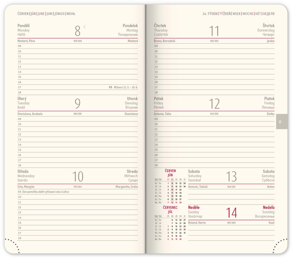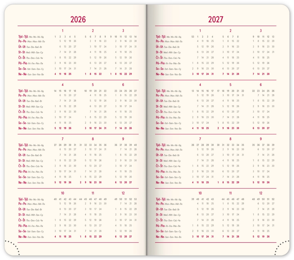 - Tjedni raspored s češko-slovačkim kalendarom dopunjenim engleskim, njemačkim, mađarskim i ruskim jezikom.