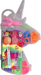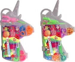 Sve je uredno zapakirano u praktičnoj plastičnoj kutiji u obliku jednoroga, koja sadrži manje odjeljke za pregledno organiziranje gumica prema bojama. Ovaj set je ne samo zabavan, već i razvija dječju kreativnost i finu motoriku.