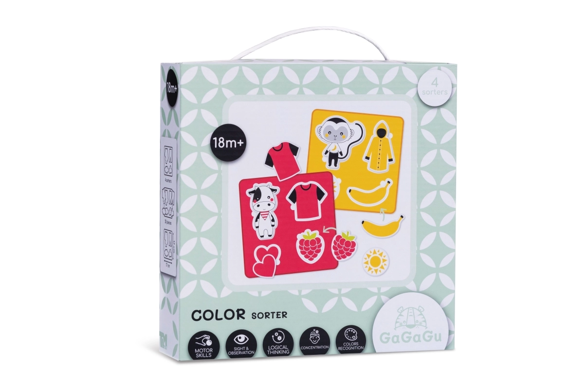Ovaj set GAGAGU učenje boja donosi djeci zabavan način učenja. Četiri ploče slagalica u različitim bojama i s različitom težinom pomažu mališanima razlikovati boje, oblike i pravilno pridruživati dijelove. Ilustracije simpatičnih životinja i njihove omiljene hrane potiču razumijevanje povezanosti i proširuju rječnik.