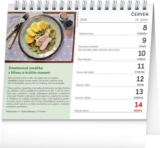 Stolni kalendar 2026 s receptima češke kuhinje, dimenzije 16,5x13 cm, sadrži blagdane i bilješke.