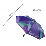 Stilski sklopivi kišobran s tamno elegantnim motivom Wednesday idealan je za ruksak i torbicu. Kompaktna izvedba omogućuje jednostavno nošenje i pouzdanu zaštitu od kiše.