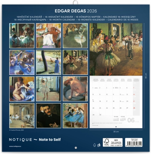 Blok-kalendar Edgar Degas 2026 nudi dvanaest remek-djela Edgara Degasa s preglednim kalendarijem, prostorom za bilješke i važnim blagdanima.