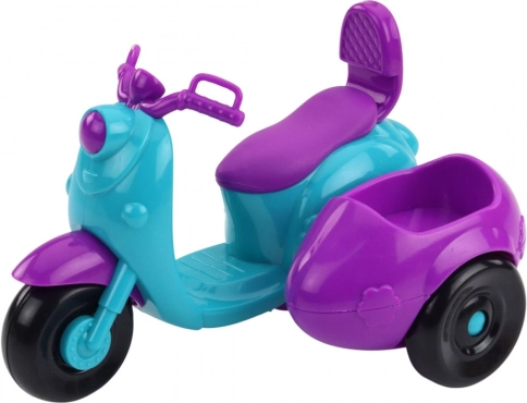 Lutka vozi trokolni skuter u intenzivnoj tirkizno-ljubičastoj boji. Prikolica sa strane skutera skriva malog psa s crvenom ogrlicom – vjernog suputnika na svakom putovanju. Set je izrađen od izdržljive, sigurne plastike, idealne za svakodnevnu igru.