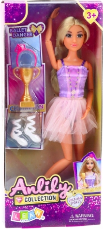 Lutka Anlily Balerina u haljini visoka je 30 cm i izrađena od sigurnog i izdržljivog materijala. Njezine nježne crte lica i duga plava kosa omogućuju stvaranje kreativnih frizura. U pakiranju se nalaze zlatni pehar, ružičaste balerinke i traka za kosu, koji savršeno upotpunjuju plesnu stilizaciju lutke.