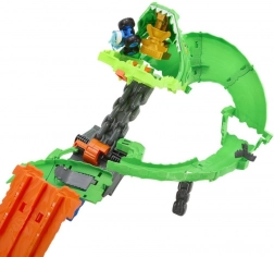 Pokreni adrenalinski dvoboj u tematskom setu „Morski psi vs. Dinosauri: Zmajeva utrka“. Ubaci oba kamiona u dvostruki izbacivač i pošalji ih paralelnom stazom ravno prema raljama kibernetičkog zmaja. O svemu odlučuje skretnica u obliku pile koja nasumično određuje hoće li se vozila zaustaviti, jedno pasti sa staze ili će oba projuriti i srušiti zmaja.