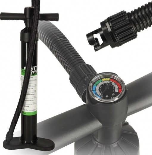 Ručna visokotlačna pumpa za SUP nezaobilazan je alat za brzo i učinkovito napuhavanje ne samo SUP dasaka, već i drugih napuhavajućih proizvoda. Zahvaljujući integriranom manometru možete točno kontrolirati tlak za optimalno napuhavanje opreme. Pumpa je opremljena stabilnim nožicama koje jamče stabilnost pri pumpanju te ‘T’ ručkom koja pruža udoban i siguran hvat, što je ključno za ugodan rad. S ovom pumpom brzo ćete pripremiti dasku za vodu i uživati u svakoj avanturi!