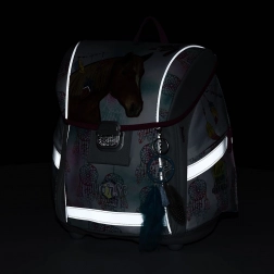 Školski ruksak iz serije Premium Light s elegantnim motivom konja nudi više od samo lijepog izgleda. Napravljen je od laganog materijala, zbog čega teži manje od 900 g. Ruksak je opremljen udobnim prozračnim podstavljanjem i širokim mekanim remenima, koji ravnomjerno raspoređuju težinu na ramena djeteta. Za dodatnu udobnost tu su trake za zatezanje i prsni remeni.
