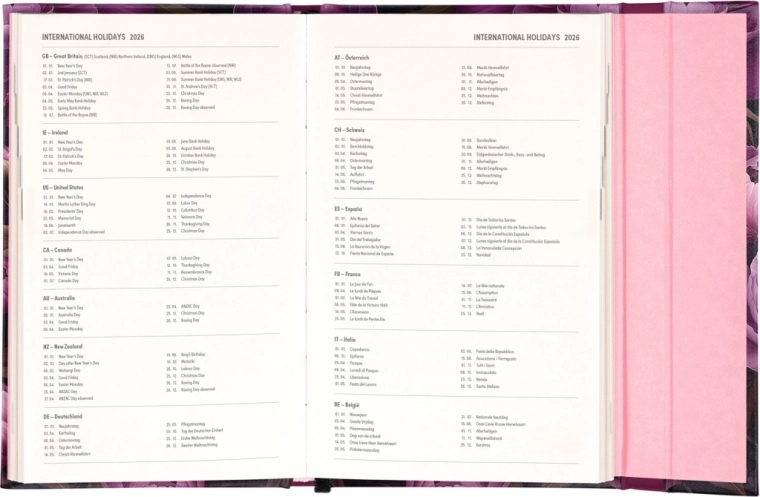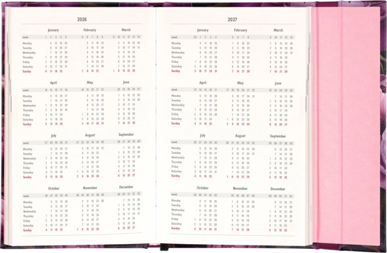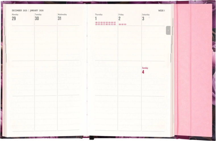Sadrži i mjesečne preglede, idealne za planiranje godišnjih odmora ili praznika. Planer nije samo praktičan, već je zahvaljujući dizajnu s motivom ljubičastih cvjetova i stilski dodatak vašem radnom stolu.