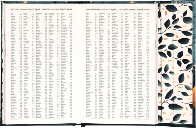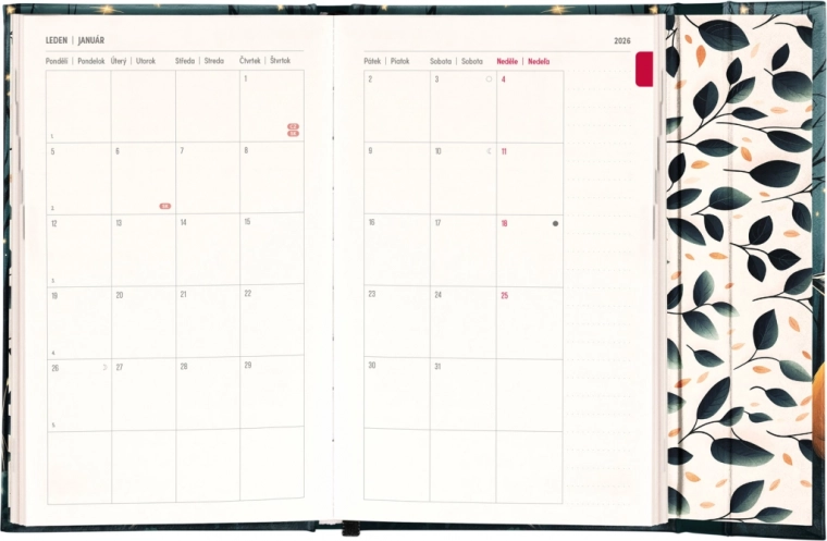 Opremljen je mjesečnim pregledima koji omogućuju lakše planiranje duljih vremenskih razdoblja poput godišnjih odmora ili školskih praznika. Ovaj planer sadrži i popis čeških i slovačkih blagdana te imendana, što omogućuje bolju organizaciju slobodnog vremena.