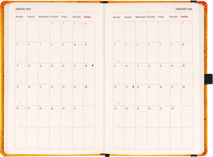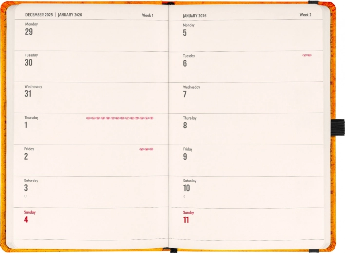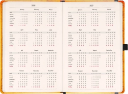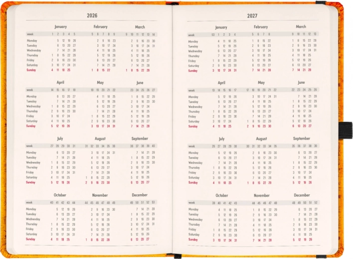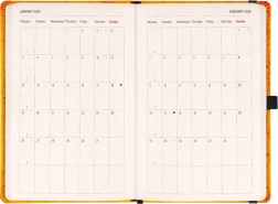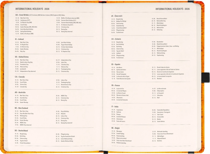 - Prva polovica sadrži dvotjedni horizontalni kalendarij s međunarodnim blagdanima.