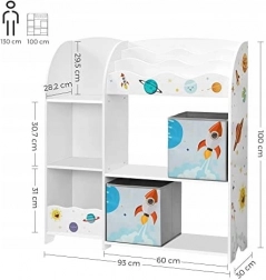 Dio pakiranja su 2 prostrana platnena spremnika, idealna za odlaganje kockica, plišanih igračaka ili sitnih dodataka. Zahvaljujući obliku i laganom materijalu, djeca ih mogu lako sama uvlačiti i izvlačiti. Spremnici su ukrašeni grafikom s motivom svemira, koja potiče dječju maštu. Spremnici su izdržljivi, a istovremeno lagani i savršeno se slažu s regalom, čime stvaraju ujednačen tematski izgled.