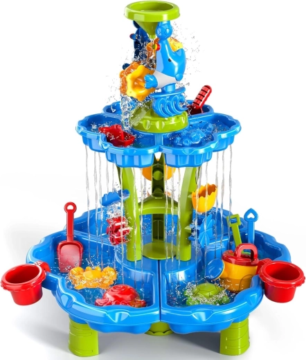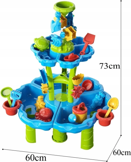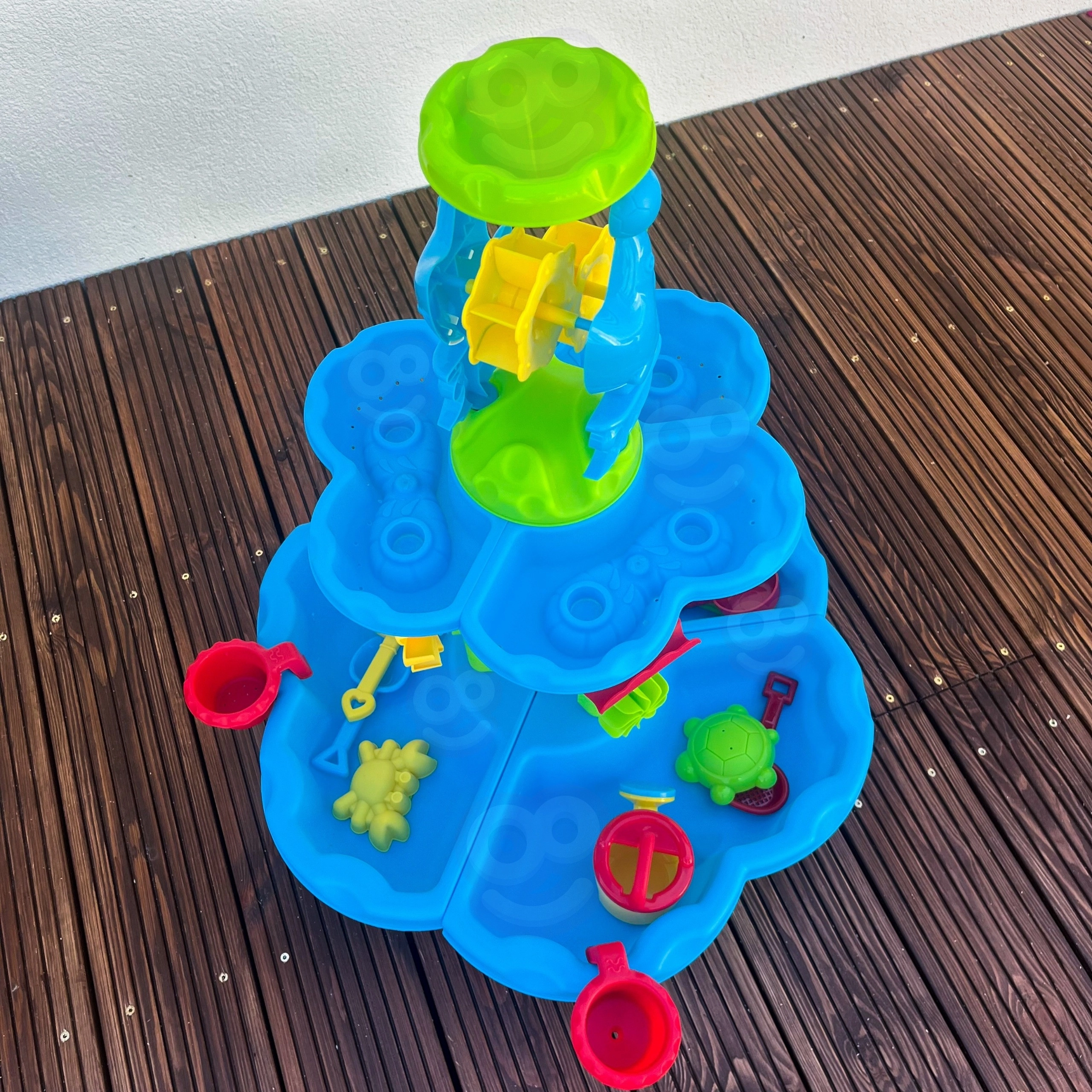 Stvorite djeci njihov vlastiti mini akvapark. Stolić nudi tri zasebne komore – jednu možete napuniti vodom, drugu pijeskom, a treću ostaviti za miješanje i eksperimente. Voda teče kroz kaskadne žlijebove, pokreće kotače i prelijeva se preko vrata, pa djeca jasno vide uzročno-posljedične veze i razvijaju finu motoriku.