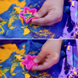 Djeca mogu stiskati, rezati i oblikovati pijesak u zvjezdice i druge motive. Sjajno za senzornu igru i razvoj fine motorike.