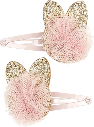 Ove prekrasne kopče za kosu namijenjene su malim damama od 3 godine nadalje. Set sadrži dvije metalne kopče s ružičastim metalik sjajem, ukrašene zlatnim aplikacijama u obliku mačke i upotpunjene ružičastim tilastim pomponom. Ovaj nježan detalj zasigurno će očarati svaku malu romantičarku. Zahvaljujući mehanizmu na klik, kopče pouzdano stoje u kosi cijeli dan. Idealne za svakodnevno nošenje i posebne prilike.