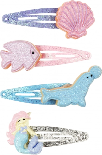 Set od četiri sjajne ukosnice za kosu s bajkovitim motivima sirene, tuljana, ribice i školjke, koje frizuri daju čaroban dojam.