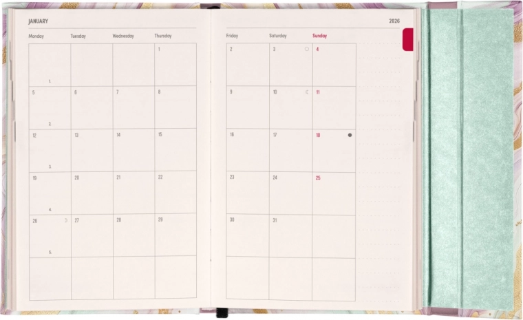 Uživajte u praktičnom planiranju s planom vođenim na engleskom jeziku, koji sadrži međunarodne praznike. Svaki tjedan je jasno prikazan na dvije stranice s dovoljno prostora za bilješke.