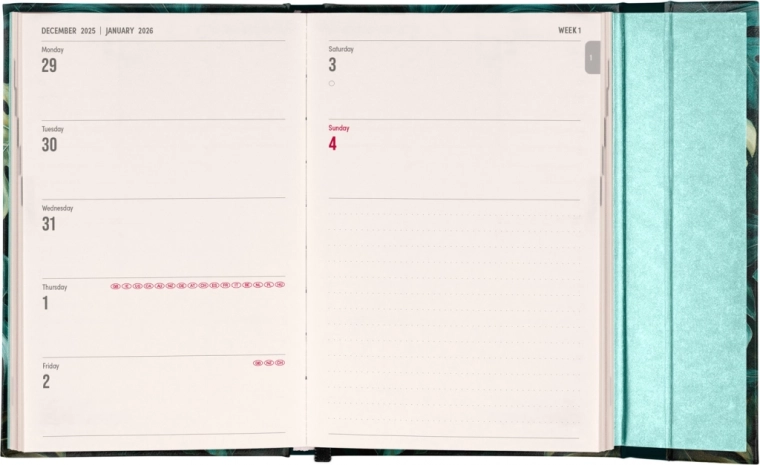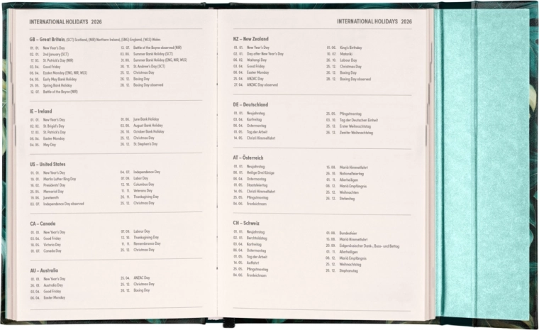 Tjedni dnevnik s magnetskim zatvaranjem i tekstovima na engleskom jeziku odličan je izbor za one koji žele imati svoje planove pregledno pod kontrolom. Ponuda tjedna na dvije stranice i međunarodni praznici pružaju udobnu osnovu za svakodnevno planiranje.