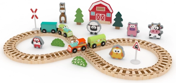 Otkrijte čaroliju drvenog svijeta s farmskim setom od 35 dijelova koji potiče dječju maštu i motoriku. Sadrži tračnice, vlakić, životinje, kućicu i stabla od ekološki održivog drva, prikladno za djecu od 3 godine.