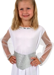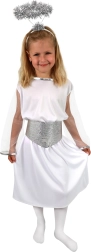 Dječji kostim Anđeo s aureolom i pojasom savršen je izbor za karneval ili tematske proslave. Kostim uključuje aureolu, pojas i haljinu. Izrađen je u srebrno-bijeloj boji koja donosi dojam čistoće i elegancije.