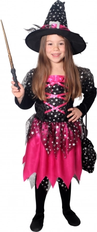 Magijski karnevalski kostim za male vještice! Crno-ružičasti kostim idealan je za djevojčice u dobi 6-8 godina, visine 117-128 cm. Ističe se ružičastim vrpcama i srebrnim zvjezdicama.