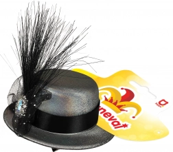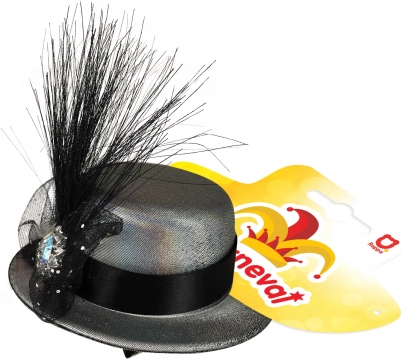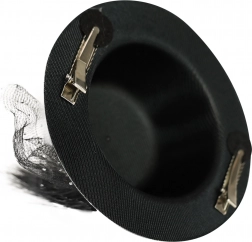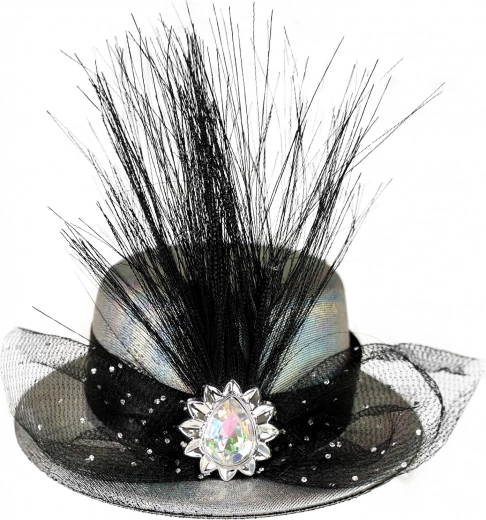 Elegantni srebrni mini šešir s crnom vrpcom, perjem i tilom, ukrašen nakitom, dodat će vašoj frizuri poseban šarm. Lako se pričvršćuje zahvaljujući dvjema šnalama za sigurno nošenje.