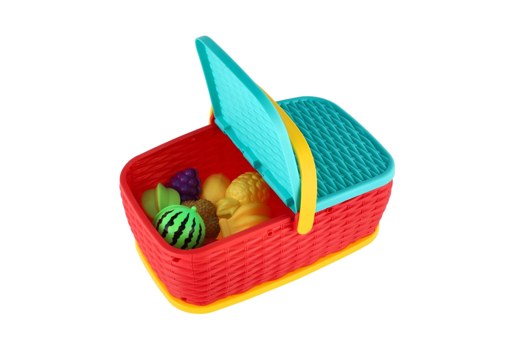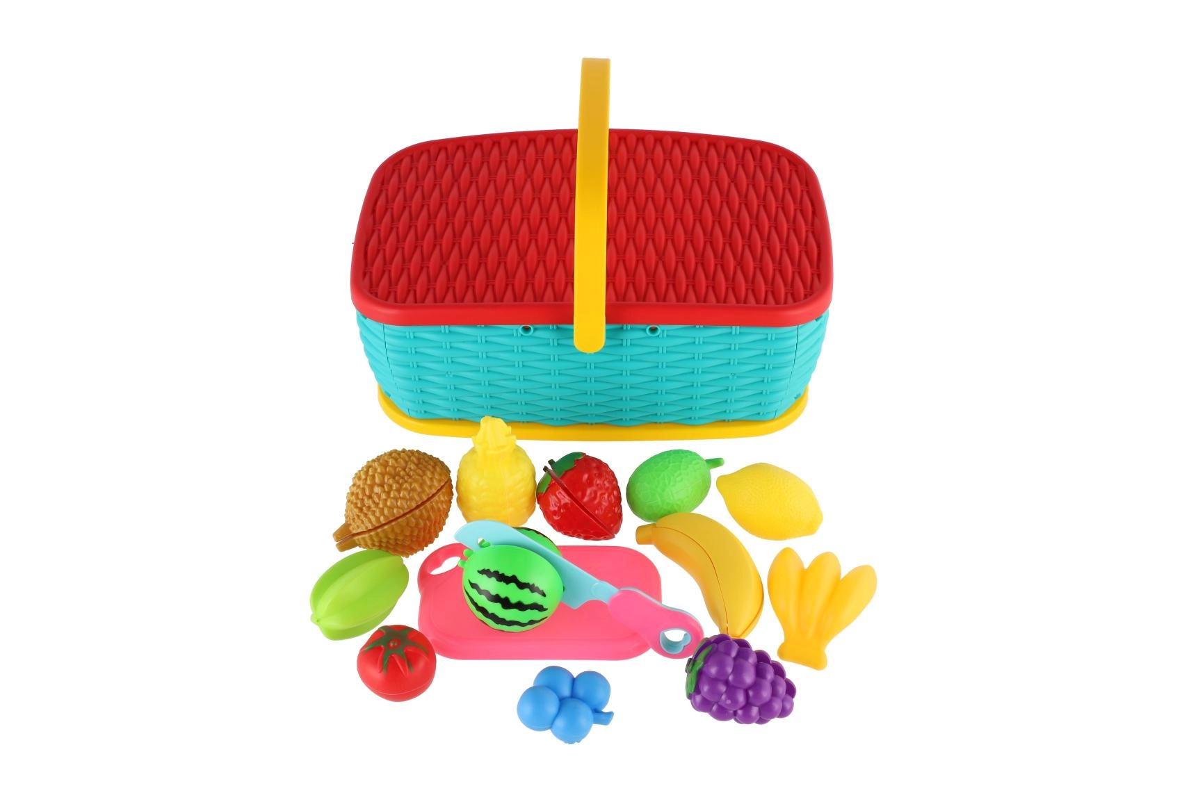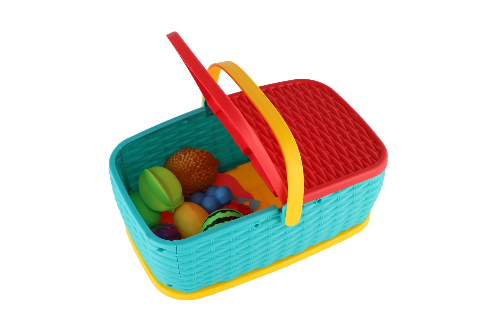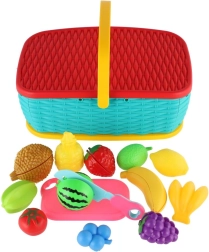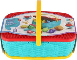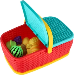 Hurá na piknik! Ova šarena plastična košara skriva set od 15 dijelova s voćem i povrćem koje djeca mogu “rezati” sigurnim plastičnim nožićem. Dijelovi su spojeni čičak-trakom, pa ih je moguće više puta razdvajati i spajati. Sjajna igračka za razvoj fine motorike, mašte i igre kuhanja.