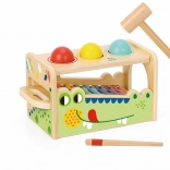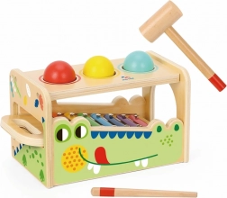 Otkrijte svijet zvukova i ritma s ovom zabavnom igračkom koja kombinira čekić za zabijanje i ksilofon. Slatki krokodil s ugrađenim ksilofonom izvrstan je za razvoj fine motorike i sluha. Nakon udarca čekićem drvene kugle propadaju, sviraju po ksilofonu i stvaraju melodiju. Zahvaljujući raznobojnim tipkama ksilofon se može svirati i samostalno.