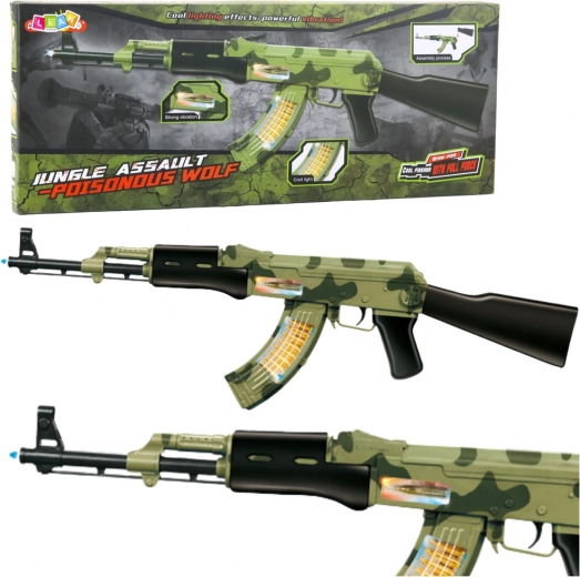 Ova vojna karabinka u šarenom moro uzorku s detaljima koji podsjećaju na pravo oružje ističe se ne samo izgledom, već i velikom duljinom – čak 70 cm. Nakon uključivanja aktiviraju se svjetlosni efekti i vibracije koji pojačavaju doživljaj realistične igre i omogućuju potpuno uživljavanje u ulogu vojnika.