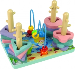 Baza sadrži labirint sa 7 perlica u različitim bojama i oblicima koje djeca mogu pomicati po stazi. Ova igračka razvija vještine poput prostorne mašte, preciznosti i manulane spretnosti.