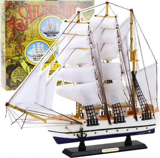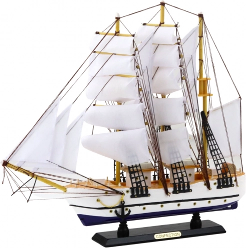 Materijalna izvedba uključuje drvenu palubu, obojene bokove te ručno zategnuta užad i jedra. Brod je postavljen na crnom postolju s natpisom „Confection“, koji naglašava njegov izložbeni karakter.
