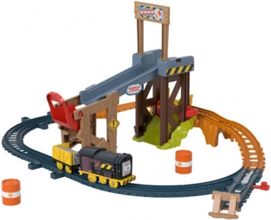 Set za igru s temom utovara s likovima iz crtića Toma i prijatelji: baterijska lokomotiva Diesel i Vagon. Pomaknite prekidač na krovu Diesela kako bi krenuo po pruzi, gdje može utovariti bačve i prevesti ih natrag do dizala i rampe.