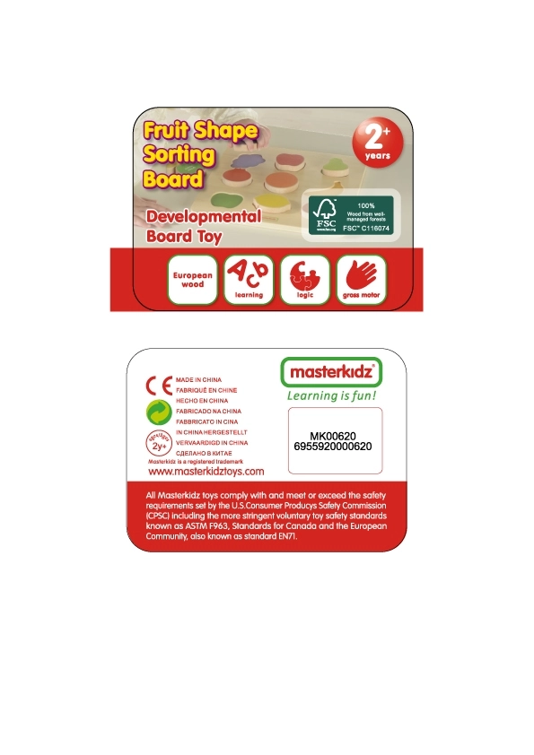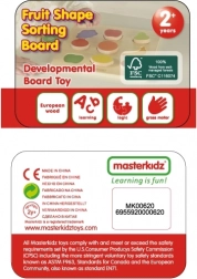 Sorter oblika Šareno Voće marke Masterkidz izvrsna je drvena igračka za djecu s mnogo namjena. Ne samo da osigurava zabavu, već također omogućuje učenje naziva voća i potiče konzumaciju voća. Dijete treba uskladiti pojedine plodove s odgovarajućim otvorima na drvenoj ploči, što zahtijeva fokus i analizu oblika. Ova aktivnost pridonosi i razvoju koordinacijskih sposobnosti.
