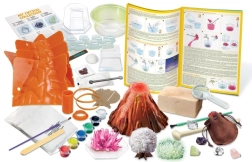 - model vulkana, blok za iskapanje s mineralima, alati (dlijeto, kist, povećalo), kalupi i posudice, boje, materijali za kristale, ilustrirane upute