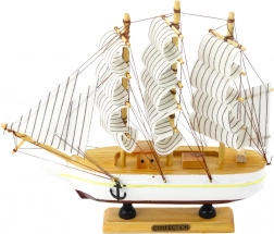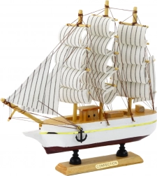 Ova replika izrađena je od drveta i ručno dovršena, što osigurava njezinu autentičnost i kvalitetu. Kombinacija svijetlog trupa i crnih pruga na bijelim jedrima stvara vizualno dojmljiv kontrast.