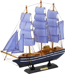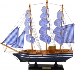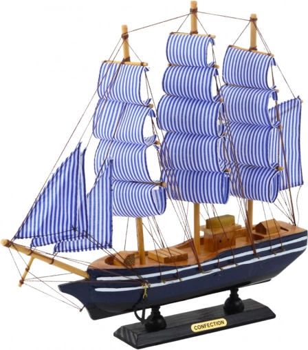 Ovaj dekorativni model trobrotne jedrilice s plavo-bijelim prugastim jedrima izrađen je od visokokvalitetnog drva s tekstilnim jedrima i detaljnom užadi. Elegantno plavo-bijelo tijelo s crnim postoljem čini estetsku cjelinu koja se uklapa u stilski interijer. Unatoč klasičnim elementima, prostoru daje moderan i lagan izgled.