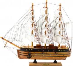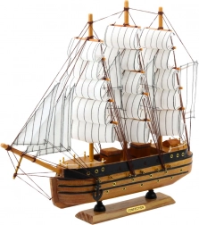 Ovaj drveni model povijesnog jedrenjaka oduševljava detaljnom izradom i stilskim dizajnom koji mu daje čar davnih pomorskih putovanja i avantura. Plovilo ima klasičan zakrivljeni trup, trojarobrodnu konstrukciju i bijela tekstilna jedra. Zahvaljujući drvenom postolju model se može postaviti na police, komode ili stolove, gdje će postati upečatljiv ukras.