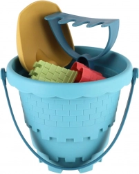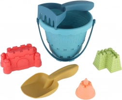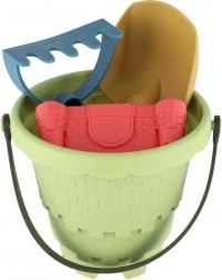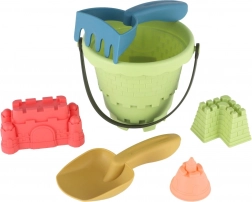 Kantica, lopatica, grabljice i tri kalupića za kreativno građenje i oblikovanje pijeska u jednom laganom setu.