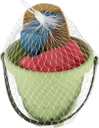 Plastični set za pijesak s kanticom, lopaticom, grabljicama i 3 kalupića u mrežici