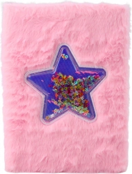 Korice su izrađene od mekog, ugodnog materijala u intenzivnoj ružičastoj boji. U središtu se nalazi prozirna aplikacija u obliku zvijezde, unutar koje su šareni konfeti koji se slobodno pomiču pri svakom pomicanju bilježnice. Ovaj detalj izdvaja proizvod od klasičnih bilježnica.