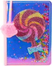 Bilježnica s holografskim omotom i šljaštećom lizalicom okruženom pomičnim konfetima u raznim oblicima i bojama je upadljiva i vesela. Prednja korica privlači pažnju zahvaljujući svojoj holografskoj površini, dok je stražnji dio ugodan na dodir zbog plišanog materijala.