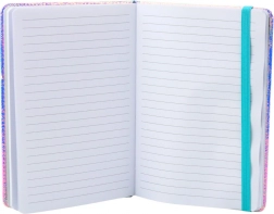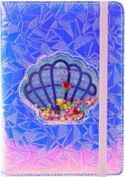 Središte korica krasi prozirna školjka ispunjena konfetićima u obliku cvjetova i srca, koji se slobodno pomiču pri svakom pokretu. Sve je upotpunjeno elastičnom gumicom kontrastne boje koja drži bilježnicu zatvorenom i štiti stranice od savijanja ili neželjenog otvaranja.